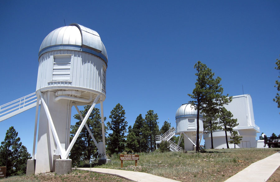 Apache Point Observatory is privately owned and operated by the Astrophysical Research Consortium. Apache Point Observatory currently operates four telescopes. The building housing the SDSS 2.5-m telescope was shown above. The image below shows the observatory buildings for the other three telescopes: the ARC Small Aperature 0.5-m Telescope, the New Mexico State University 1.0-m Telescope and the ARC 3.5-m Telescope. The ARC Small Aperature 0.5-m Telescope was originally used for photometric calibrations on SDSS. Now it is used for general observing and public outreach. The New Mexico State University 1.0-m Telescope is used for instruction and research. The ARC 3.5-m Telescope is used primarily for objects that require many short observations over long periods and targets of opportunity that require a quick response.