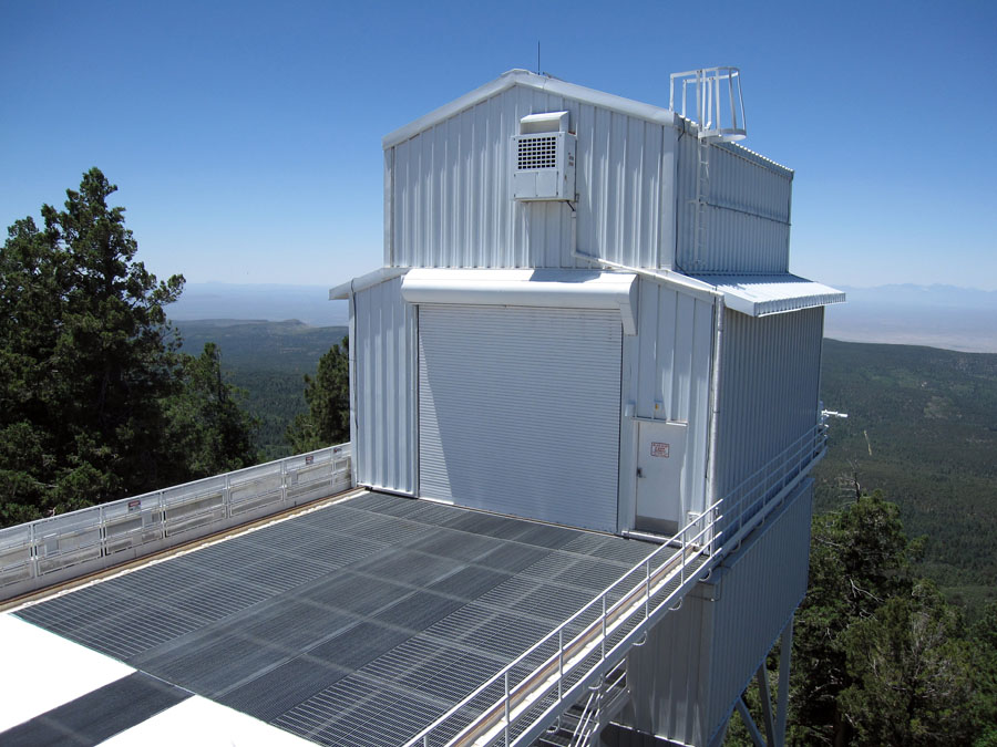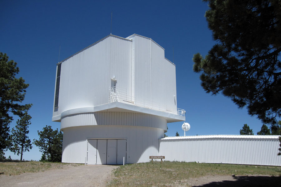 Many of you will probably be more familiar with the Apache Point Observatory than you are with Sunspot even if you don't immediately recognize the name. Apache Point is the home of the Sloan Digital Sky Survey (SDSS) 2.5-meter Telescope. The observatory that houses the 2.5-m telescope is shown below. The telescope is exposed for observations by moving the whole building down a track. (The individual tracks can be seen if you click on this picture and look at the larger image.)