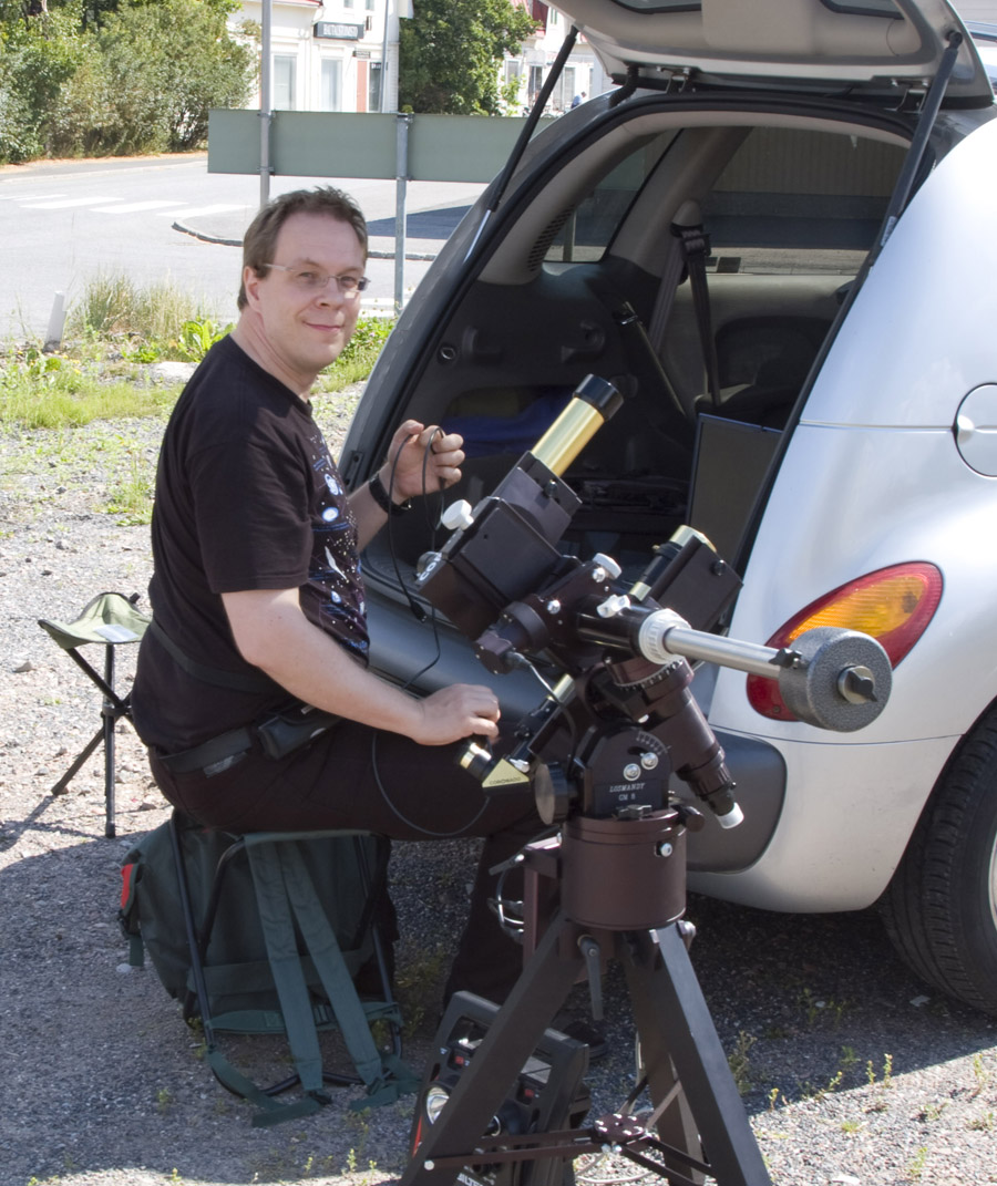 Pekka Rautajoki lives in the city of Tampere in Finland some 100 miles north of the capital city of Helsinki. He works in the marketing department of Nokia Siemens Networks a manufacturer of telecommunications equipment. During his free time he is fond of stargazing – he's particularly interested in the Sun. He is also interested in scale modeling. He is the chairman of the local astronomy club Tampereen Ursa focusing on outreach activities rather than semi-pro research.