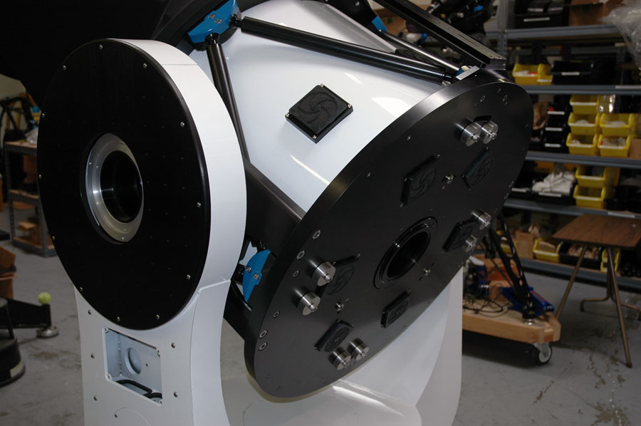 The image below shows the primary product assembly area at PlaneWave Instruments. The large telescope in the middle of this picture is the 28" (0.7m) CDK700 Observatory Telescope System. The mount on the right is an Ascension 200 mount undergoing testing. (PlaneWave doesn't just make telescopes; they also manufacture German Equatorial Mounts.) The two telescopes on the floor to the left of the 28" scope are CDK17s.