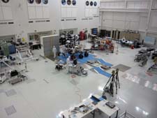 This image shows the Spacecraft Assembly Facility for the Mars Curiosity rover. The object in the center of the picture on the blue flooring is the Curiosity rover itself. To the right of Curiosity is the actual spacecraft which will protect the rover. You can find more information on the Mars Science Laboratory here: http://mars.jpl.nasa.gov/msl/