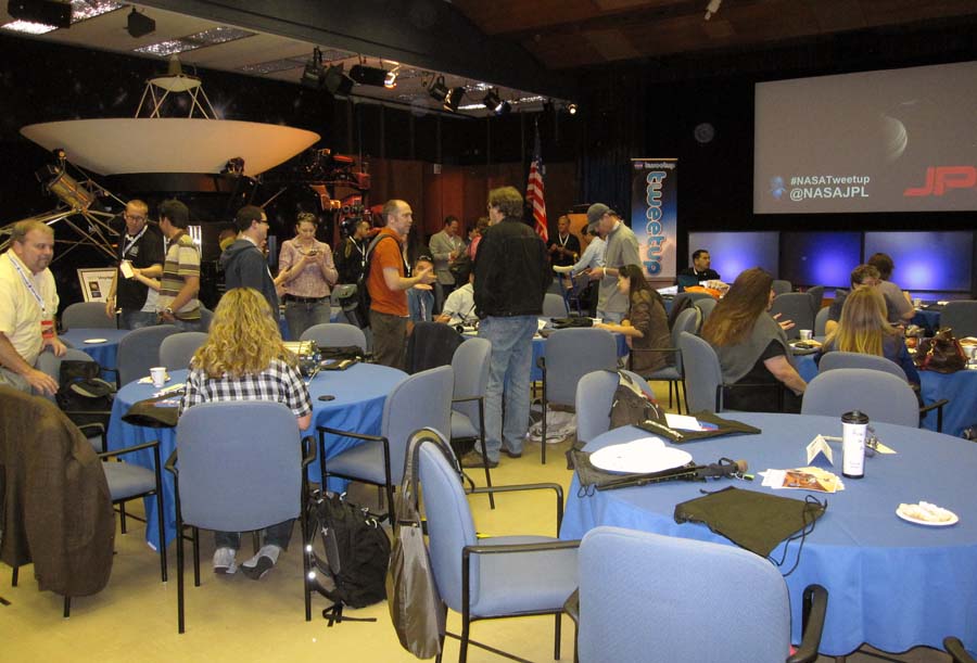 The program portion of the tweetup was held in the von Karmen auditorium. This image shows a portion of the room. The spacecraft in the background in a full-size mockup of the Voyager spacecraft: